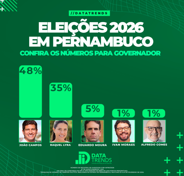 O instituto DataTrends Pesquisas divulgou seu primeiro levantamento sobre a disputa pelo Governo de Pernambuco nas eleições de 2026. A pesquisa foi realizada entre os dias 23 e 24 de