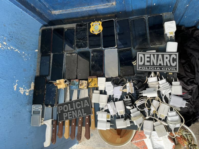 Na cela 13, os policiais apreenderam 765 porções de maconha tipo “flor”, embaladas em sacos do tipo ziplock. Também foram encontrados uma pedra de crack de aproximadamente 5g, celulares, carregadores e facas artesanais.