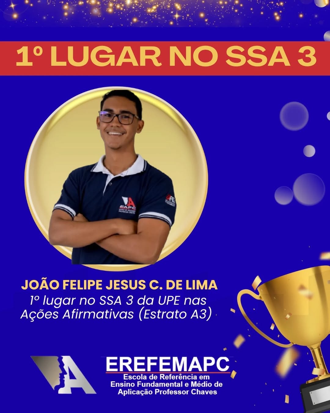 A Escola de Aplicação Professor Chaves, localizada em Nazaré da Mata, comemora um importante resultado no desempenho educacional. O aluno João Felipe Jesus Cavalcanti de Lima conquistou o 1º lugar no SSA 3 da Universidade de Pernambuco, na modalidade Ações Afirmativas (Estrato A3).