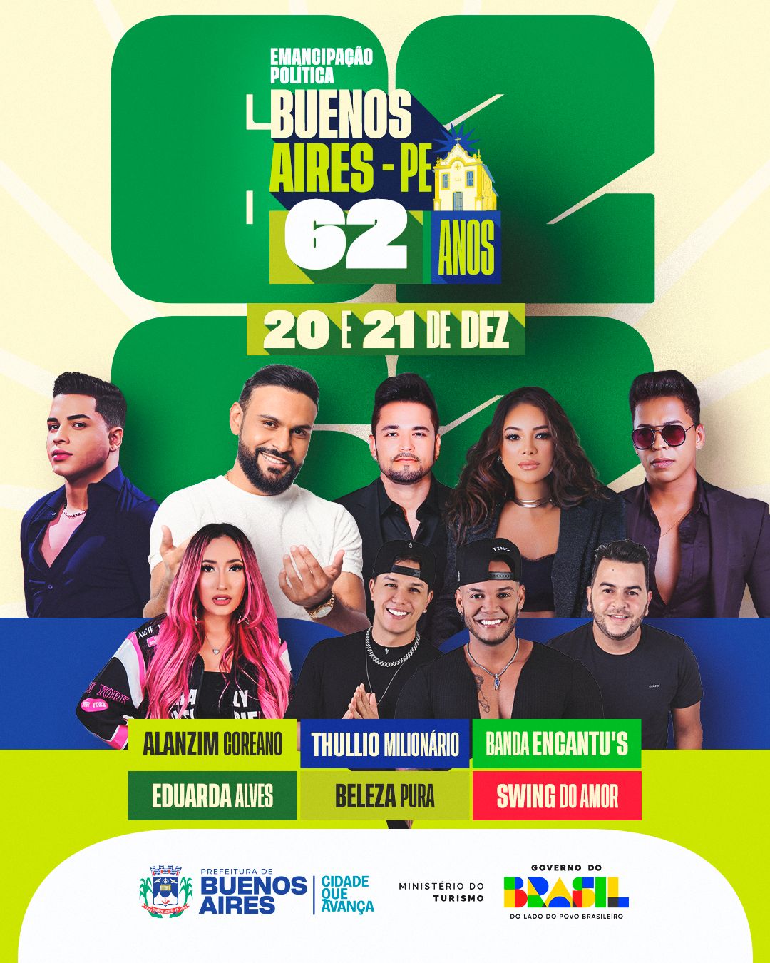 O município de Buenos Aires, na Zona da Mata Norte de Pernambuco, comemora seus 62 anos de emancipação política com uma programação especial nos dias 20 e 21 de dezembro. A celebração contará com grandes atrações musicais que prometem movimentar a cidade e atrair público de toda a região.