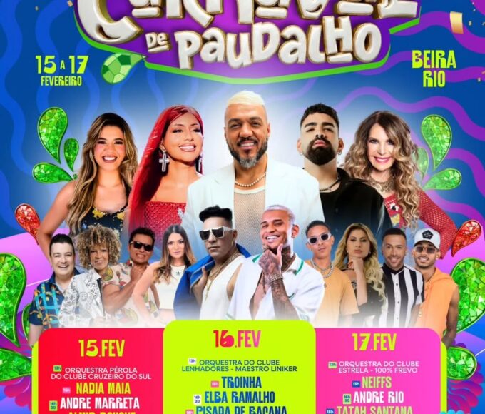 Entre as atrações confirmadas estão MC Troinha, Raphaela Santos, André Rio, André Marreta, MC Thayk e Os Tralhas. A programação também valoriza a cultura popular, com apresentações de Andrielly Souza, Carina Lins, Cíntia Barros, Zezé Corrêa, Maciel Salu, Família Salustiano e a Rabeca Encantada, reforçando o compromisso com as raízes culturais do município.