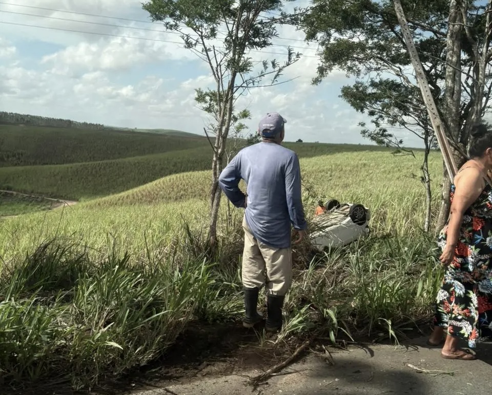Um carro capotou na rodovia PE-059, entre os municípios de Buenos Aires e Nazaré da Mata, na altura da comunidade de Camarazal, zona rural de Nazaré da Mata, na manhã desta terça-feira (10).