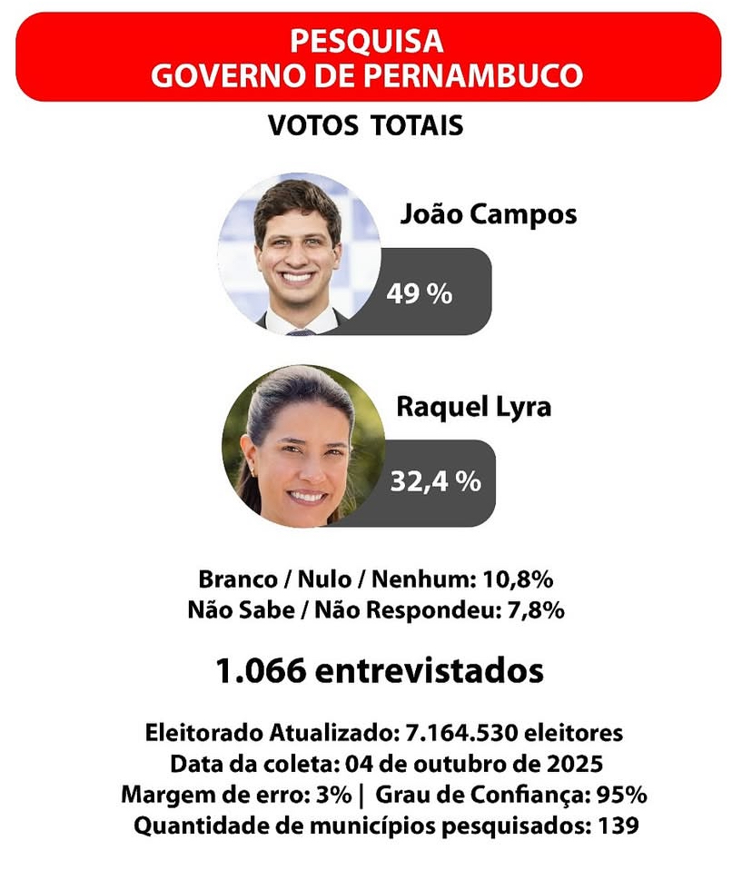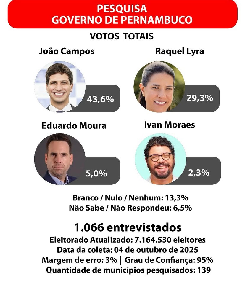 Uma nova pesquisa de intenção de voto divulgada no dia 4 de outubro de 2025 mostra um retrato atualizado da corrida eleitoral para o Governo de Pernambuco. O levantamento, realizado com 1.066 entrevistados em 139 municípios do estado, aponta como os eleitores estão se posicionando a um ano das eleições estaduais.