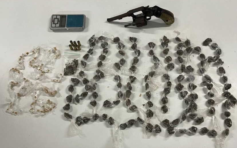 Durante a abordagem e revista pessoal, foram encontradas porções de maconha e diversas pedras de crack já fracionadas para venda, além de um revólver calibre 38 e uma balança de precisão, material que, segundo a polícia, seria utilizado para o tráfico.