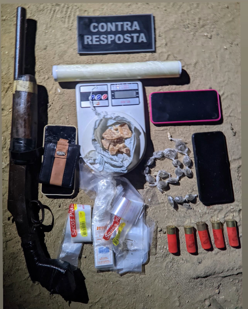 Durante a ação, os policiais localizaram porções de entorpecentes e uma arma de fogo, além de outros materiais que reforçam a atividade criminosa do grupo. Os suspeitos foram detidos e encaminhados à delegacia para serem tomadas as medidas cabíveis.
