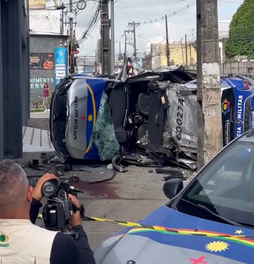 A viatura onde estavam os policiais, um veículo modelo Spin, capotou após atingir outro carro e, com a força do impacto, foi arremessada, ficando prensada entre um poste de energia elétrica e o muro de uma igreja evangélica.