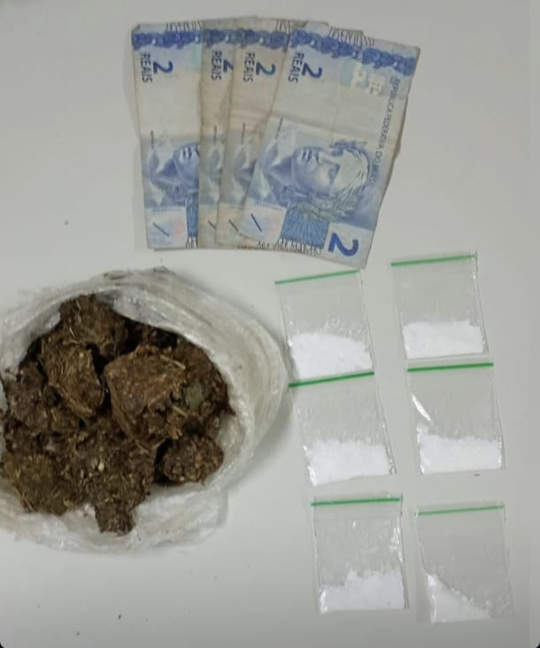 Com o suspeito, os policiais apreenderam uma bolsa contendo seis unidades de cocaína, 79 gramas de maconha, a quantia de R$ 8,00 em espécie e um celular, que o próprio indivíduo afirmou ser de sua propriedade.