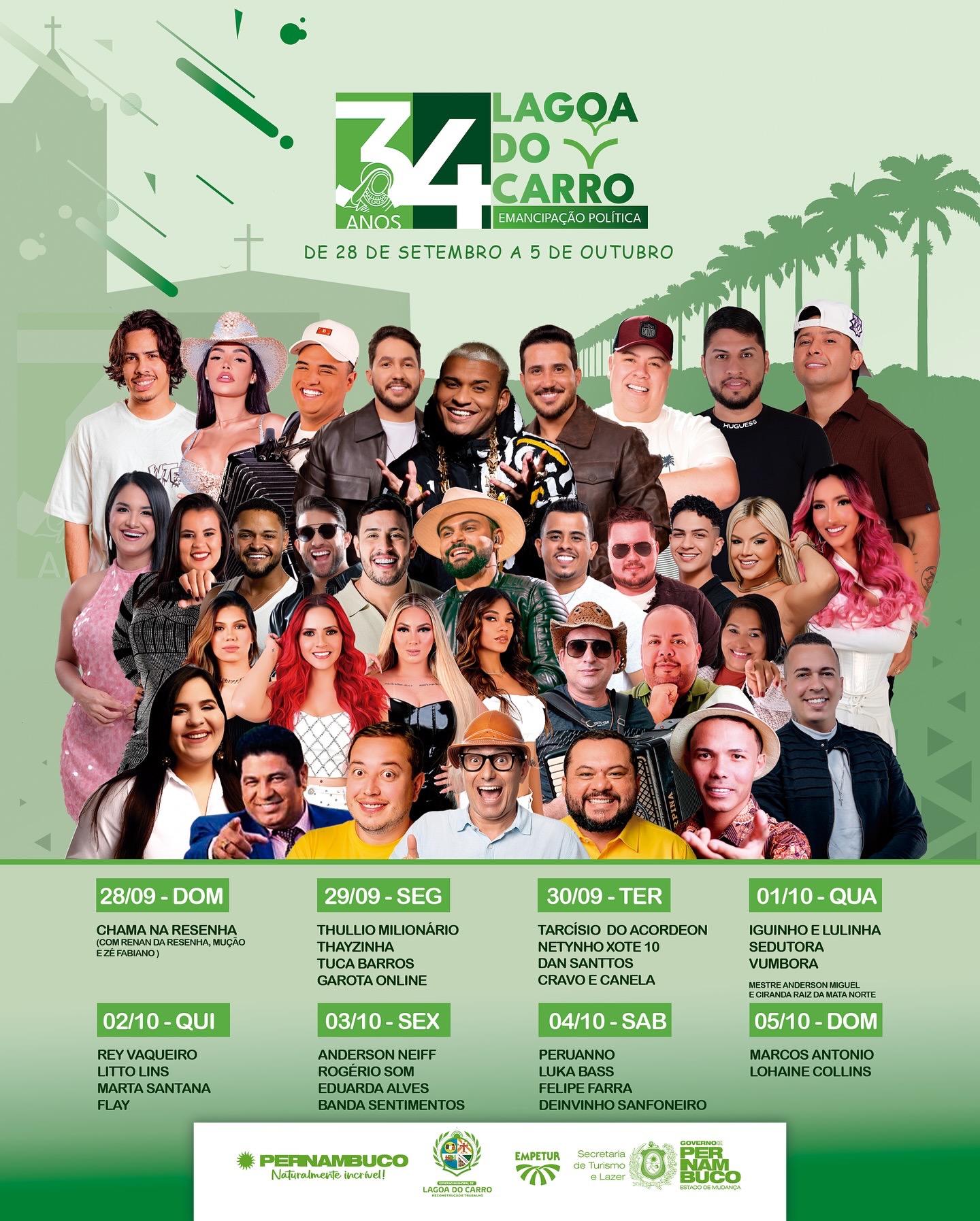 O município de Lagoa do Carro, na Zona da Mata Norte de Pernambuco, se prepara para celebrar seus 34 anos de emancipação política com uma grande programação cultural e musical que promete movimentar a cidade entre os dias 28 de setembro e 5 de outubro.