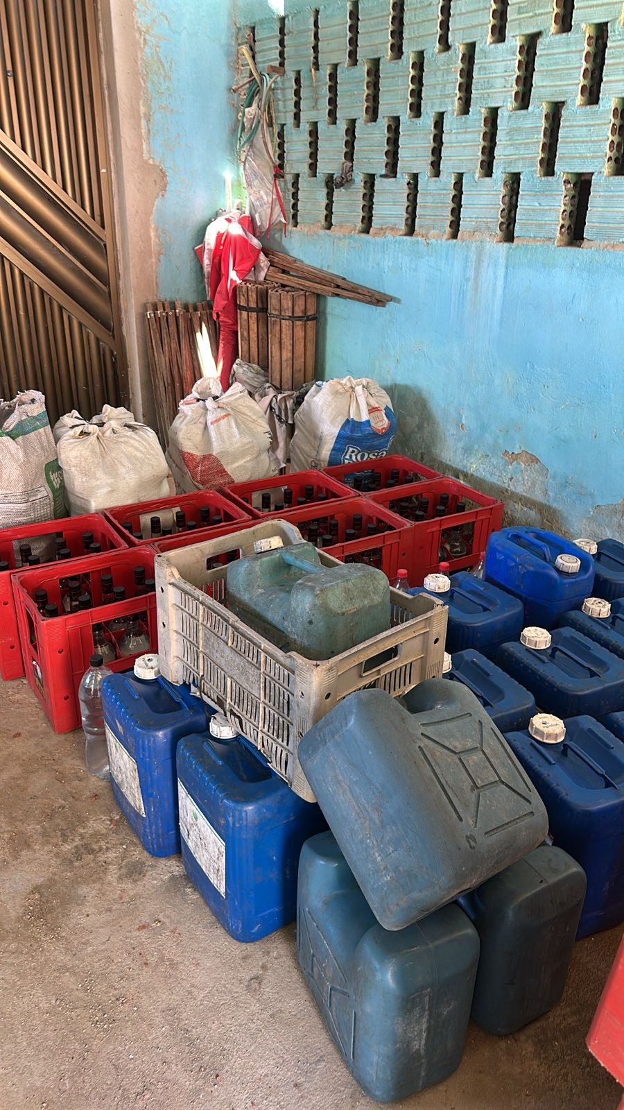 A ação foi deflagrada após uma denúncia sobre a existência de uma possível fábrica clandestina de bebidas. No local, os agentes encontraram galões com líquido semelhante a álcool, vasilhames vazios, caixas d’água utilizadas no processo de produção e um botijão com torneira adaptada para engarrafamento.