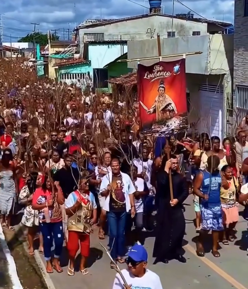 No último domingo (10), a Procissão do Carrego da Lenha reuniu centenas de fiéis no distrito quilombola de São Lourenço, em Goiana, na Mata Norte de Pernambuco. A caminhada, liderada pelo Padre Cleiton José, teve início com o religioso carregando a bandeira de São Lourenço Mártir, padroeiro da comunidade.