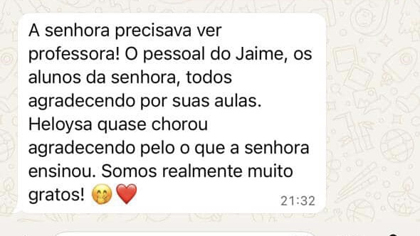 “A senhora precisava ver, professora! O pessoal do Jaime, os alunos da senhora, todos agradecendo por suas aulas. Heloysa quase chorou agradecendo pelo que a senhora ensinou. Somos realmente muito gratos”, contou uma das estudantes.