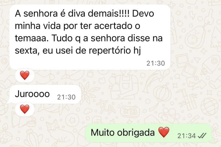 “A senhora é diva demais! Devo minha vida por ter acertado o tema! Tudo o que a senhora disse na sexta, eu usei de repertório hoje.”