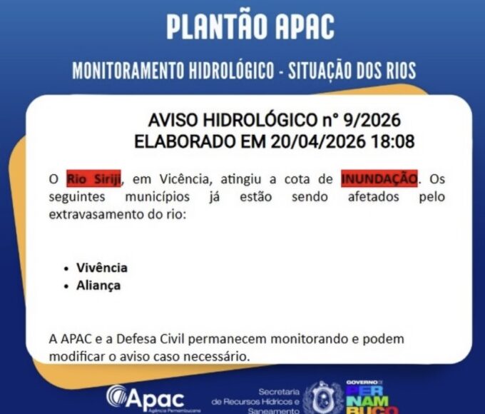 A APAC emitiu o Aviso Meteorológico nº 36/2026, colocando áreas do litoral pernambucano em estado de observação devido à previsão de pancadas de chuva com intensidade moderada entre a noite deste domingo (19) e a segunda-feira (20).