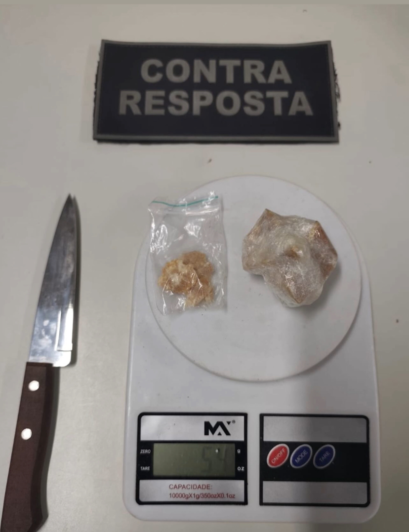 Durante o acompanhamento, os policiais flagraram o suspeito arremessando uma bolsa plástica ao chão. Ao ser alcançado, Pedro Henrique tentou resistir à prisão, portando uma faca. No confronto, um dos militares foi ferido na perna, mesmo com o uso moderado da força policial.