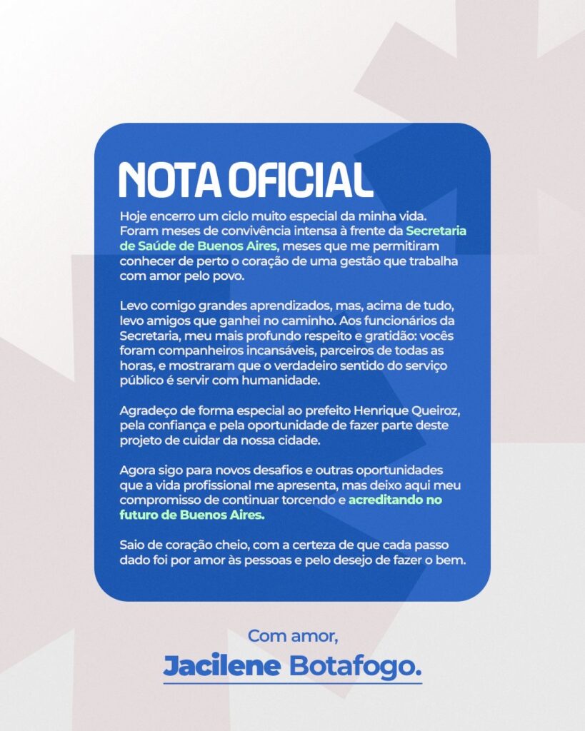 Em texto divulgado nas redes sociais, Jacilene Botafogo agradeceu à equipe da Secretaria, ao prefeito Henrique Queiroz e à população de Buenos Aires.